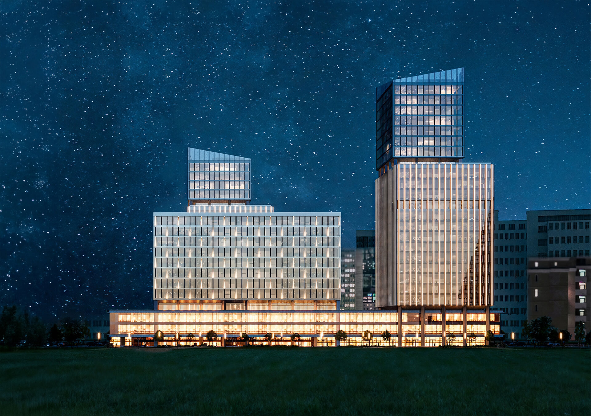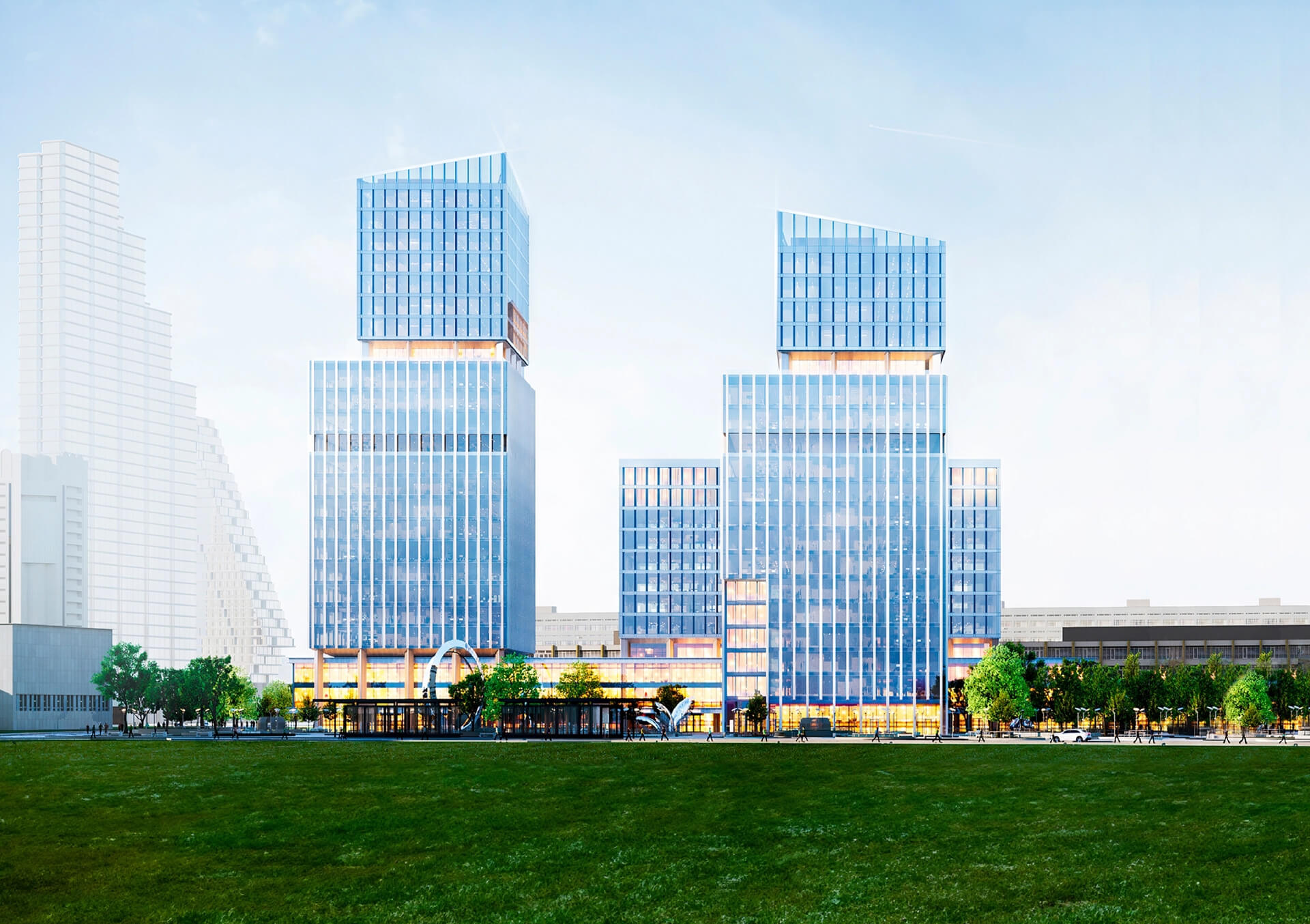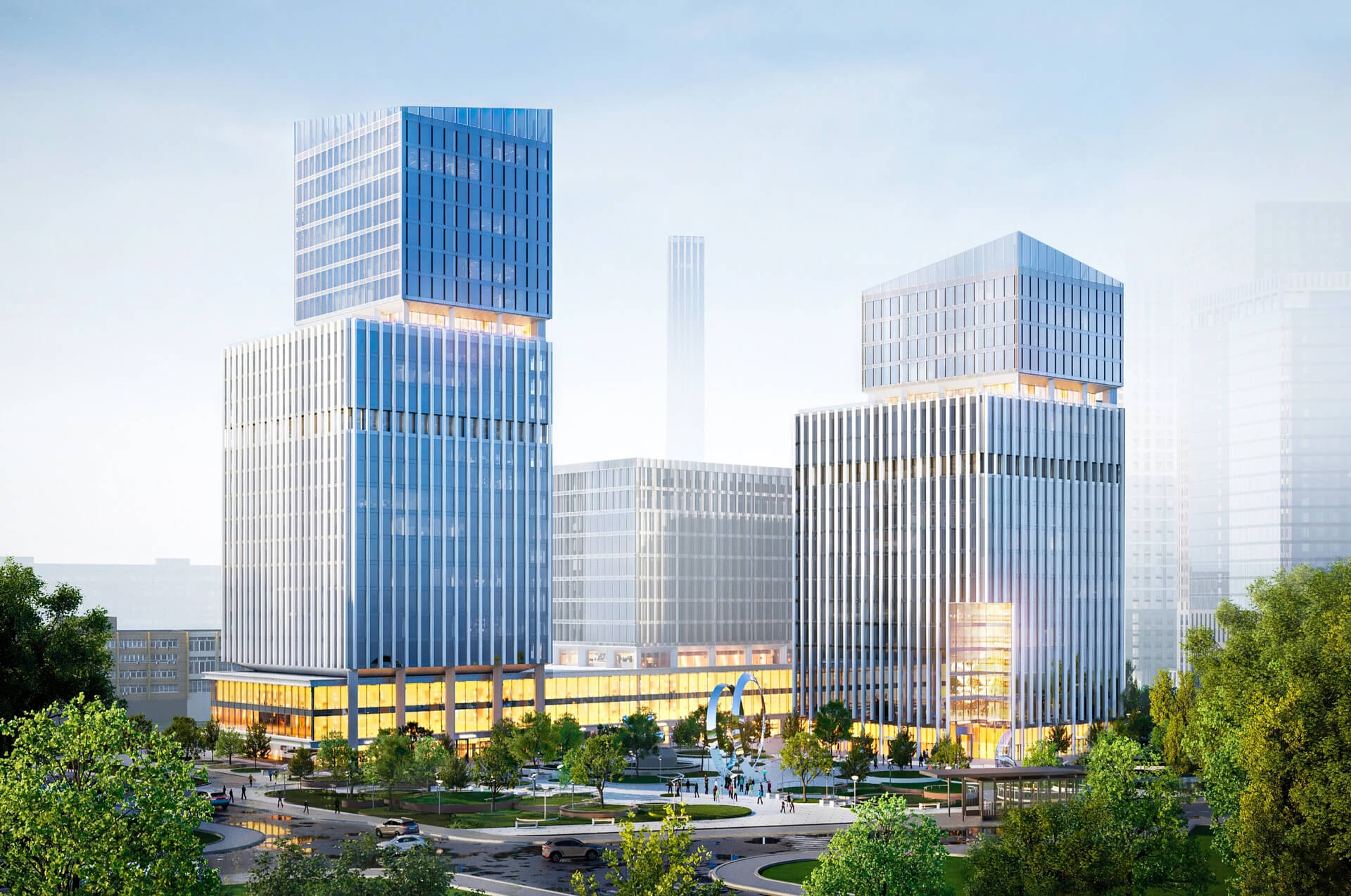 Особое внимание уделено внутренним пространствам: просторные двусветные лобби с высотой потолков до 8 метров обеспечивают атмосферу комфорта и престижности. Развитая инфраструктура бизнес-центра включает кафе, рестораны, магазины, аптеки и салоны красоты, что позволяет удовлетворить все потребности резидентов без необходимости покидать территорию.