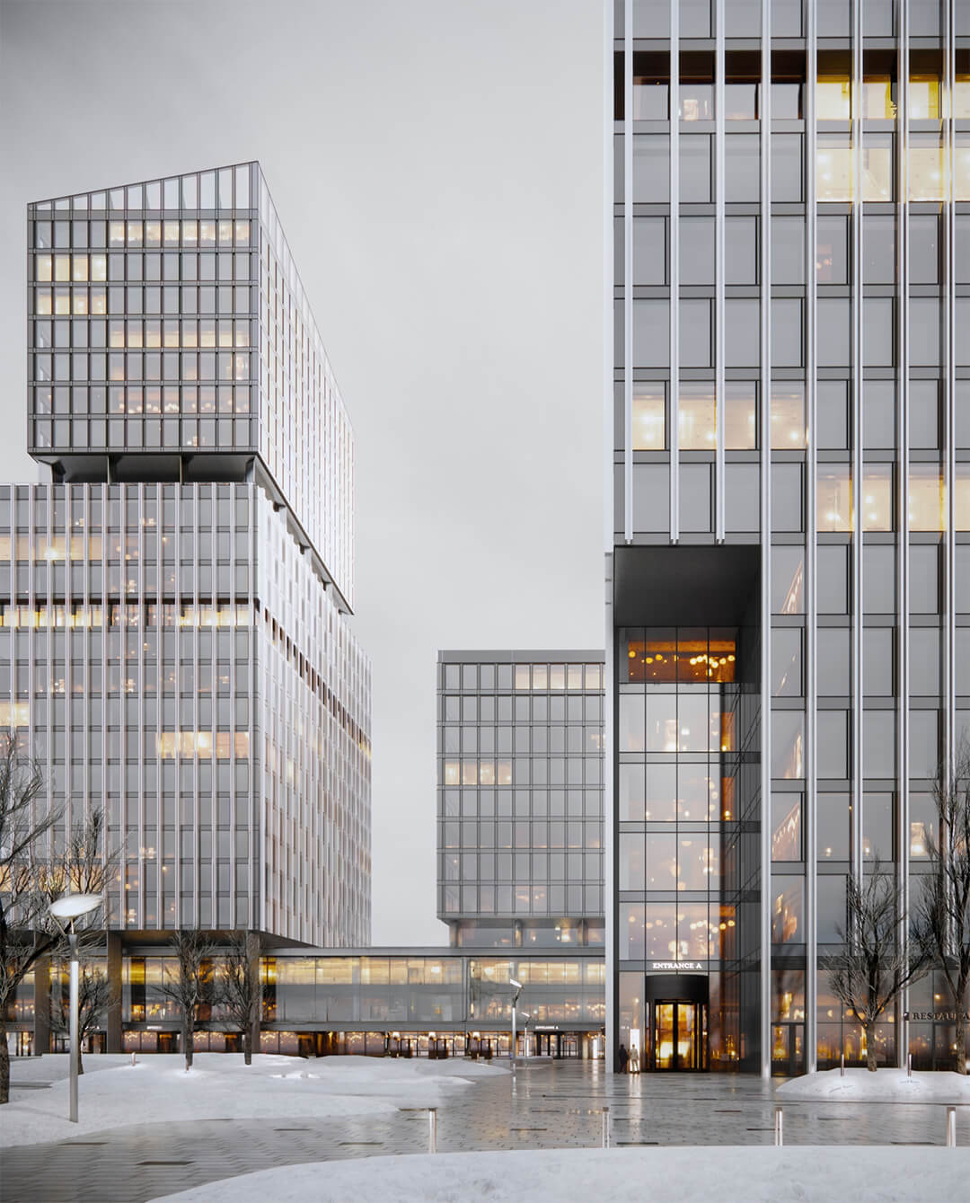 Для фасада использованы высококачественные материалы, обеспечивающие долговечность и элегантный внешний вид. Премиальная отделка подчеркивает статус объекта класса «А», а продуманное зонирование позволяет создать комфортные условия для бизнеса.